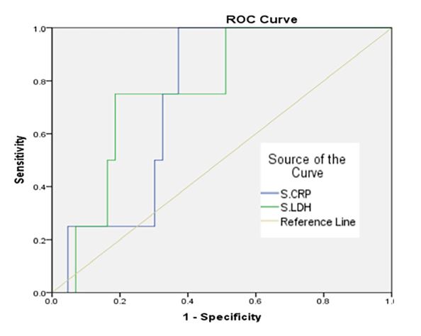 ROC analysis for serum CRP and LDH levels demonstrated significant discriminative ability: