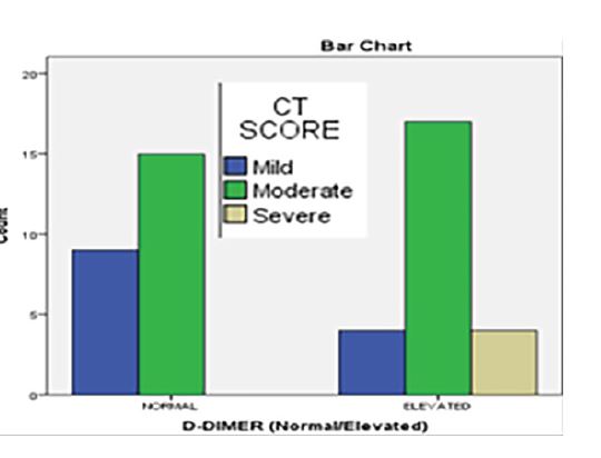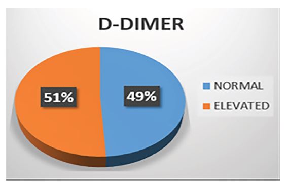 Elevated D-dimer levels were found in 51% of cases, including all severe CT cases, 53% of moderate cases, and 30% of mild cases.No significant difference in D-dimer levels was observed across severity categories (P = 0.129) (Figure 3).