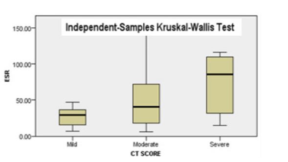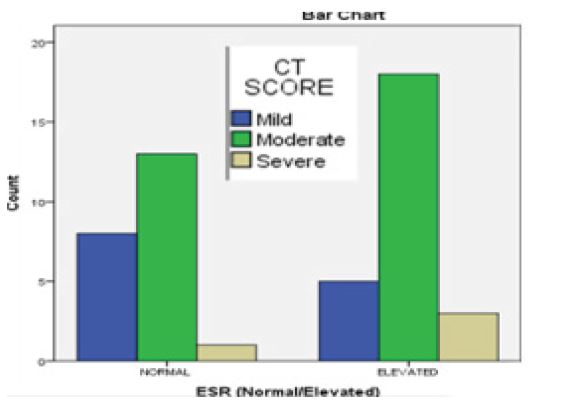 Elevated ESR was found in 54% of patients, with raised ESR levels in 55% of severe CT cases, 59% of moderate cases, and 39% of mild cases.No statistically significant variation was observed (P = 0.363) (Figure 5).