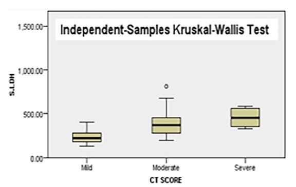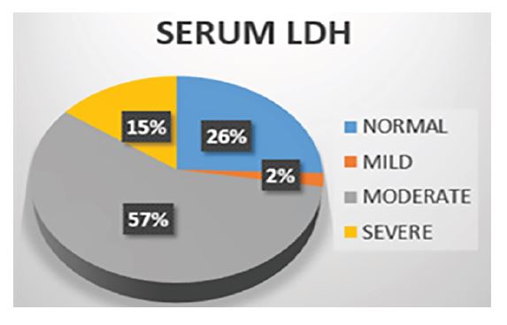 Mild elevation (<240 U/L) was seen in 2%, moderate elevation (240-550 U/L) in 57%, and severe elevation (>550 U/L) in 15% of cases.75% of severe CT cases and 60% of moderate CT cases exhibited moderate LDH elevation.A significant variation in LDH levels across severity groups was observed (P = 0.001) (Figure 2).