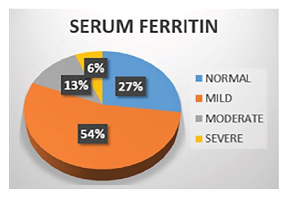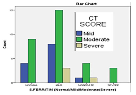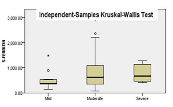 Mild elevation (<1200 ng/mL) was observed in 54%, moderate elevation (1200-2400 ng/mL) in 13%, and severe elevation (>2400 ng/mL) in 6% of cases.No significant variation was noted between CT severity groups (P = 0.232) (Figure 4).