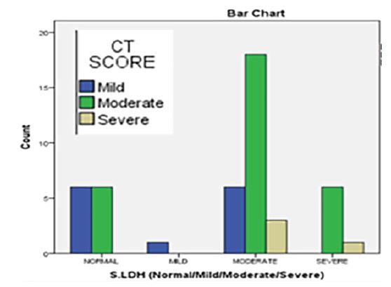 Serum LDH levels also showed a strong link with CT severity scores (P <0.005). This aligns with the findings of Andrea Leonardi et al., who reported a strong correlation between lung damage observed on CT and LDH levels (r = 0.718, P <0.05).2