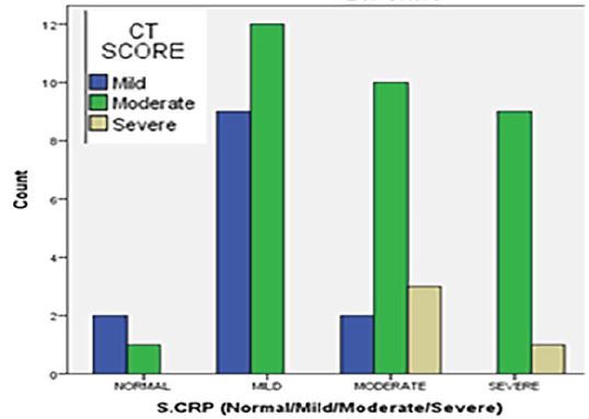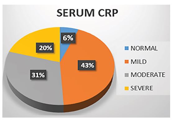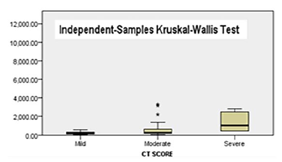 Mild elevation (3-50 mg/L) was observed in 43%, moderate elevation (50-100 mg/L) in 31%, and severe elevation (>100 mg/L) in 20% of cases.75% of severe CT cases exhibited moderate CRP elevation, while 70% of mild CT cases showed mild CRP elevation.Statistical analysis revealed significant variation in CRP levels across CT severity categories (P = 0.022). Median CRP levels increased with severity (Figure 1).