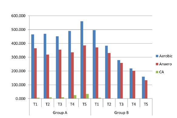 The mean and standard deviation of CFU counts for the control group (Group A) and the test group (Group B) at various time intervals at day 1 (T1), 1 week (T2), 1 month (T3), 3 months (T4), and 6 months (T5), are presented in Table 1. When compared using the independent samples t-test across time intervals from T2 to T5, Group A showed significantly higher CFU values compared to Group B for aerobic bacteria, anaerobic bacteria, and C. albicans. This finding indicates that Group B demonstrated greater antimicrobial activity from T2 to T5. However, at T1, no significant difference was observed between the two groups for any of the tested microorganisms (Table 1). The mean CFU values across all time points (T1 to T5) for aerobes, anaerobes, and C. albicans (CA) are illustrated in Figure 4.