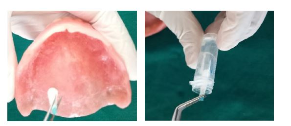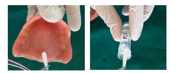 The antimicrobial effect of complete dentures in both groups was evaluated by counting the number of cultivable cells in the biofilm, determined through enumeration of colony forming units (CFUs). Briefly, after the specified time interval, participants were recalled for sample collection. Swabs were collected in the morning, and participants were asked to wear their prosthesis continuously and refrain from rinsing for at least four hours prior to sample collection. Swabs were obtained from the entire tissue-contacting surface of each complete denture at the following intervals: day 1 (T1), 1 week (T2), 1 month (T3), 3 months (T4), and 6 months (T5). Swabs collected from both the test and control groups were stored in reduced transport fluid (RTF) and transported to the microbiology laboratory for assessment of antimicrobial activity (Figure 2).