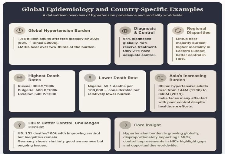 This review is especially relevant in 2025 in light of the recent WHO Global Hypertension Report 2024 and renewed global efforts aiming to reduce the hypertension burden and disparities. These developments underscore the urgent need for updated synthesis of epidemiology, pathophysiology, pharmacotherapies, and patient centered care strategies. By bridging scientific understanding with practical healthcare delivery, this review aims to identify actionable pathways for reducing the global hypertension burden and its associated inequities.