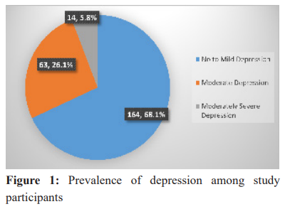 A total of 241 patients were included in the study. The mean age was 53.95 ± 12.10 years, with 151 (62.7%) females and 90 (37.3%) males. The prevalence of moderately severe depression was 5.8% (n=14), while moderate depression was observed in 26.1% (n=63). The majority of patients fell into the no-to-mild depression category (n=164; 68.1%). Notably, no patient in our study had severe depression (Figure 1).