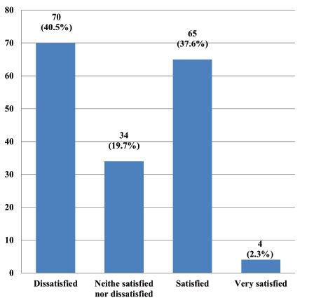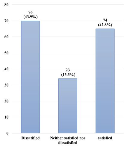 Of the participants, 43.9% reported poor perceived quality of life, 13.3% reported neither poor nor good, and 42.8% reported good perceived quality of life (Figure 1). Only 2.3% were very satisfied with their health, while 40.5% were dissatisfied (Figure 2). The mean transformed scores across the WHOQOL-BREF domains were as follows: physical domain – 49.94 ± 17.88; psychological domain – 51.72 ± 15.18; social domain – 53.23 ± 19.23; and environmental domain – 55.65 ± 14.30. In terms of domain-specific QoL, 43.9% had poor QoL in the physical domain, 37.6% in the psychological domain, 29.5% in the social domain, and 21.4% in the environmental domain (Table 2). Older age, lower education levels, hypertension, longer duration of diabetes (6–10 years), belonging to a nuclear family, and lower socio-economic status were significantly associated with poorer perceived QoL. In contrast, being unmarried, unemployed, or self-employed, and having stronger social relationships were associated with a better perceived quality of life (Table 3).